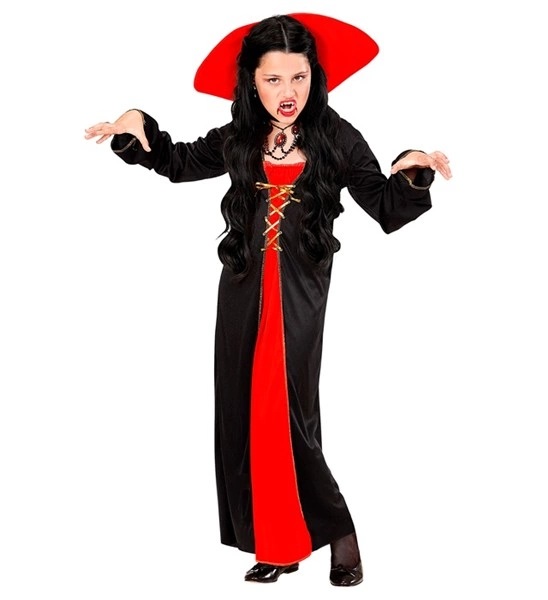 Costumul Vampirita Nobila Copii include rochia cu snur in partea din fata, guler inalt si maneci lungi.