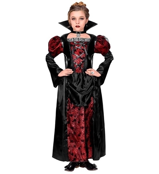 Costum Vampirita Regala Copii include rochia cu crinolina atasata, guler inalt si colierul cu piatra.