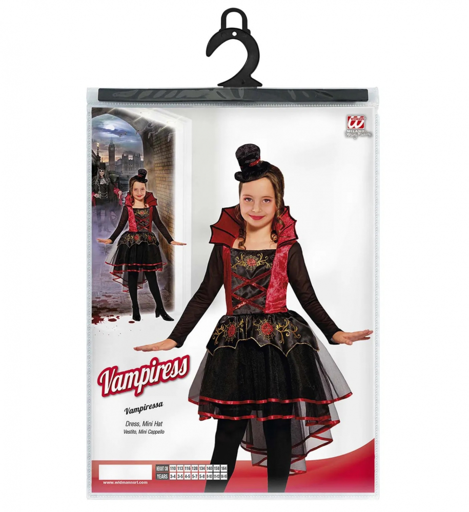 Costum Vampirita Regina include rochia cu imprimeuri aplicate, fusta din tiul cu panglici din satin aplicate, gulerul inalt si bentita cu mini palarie.