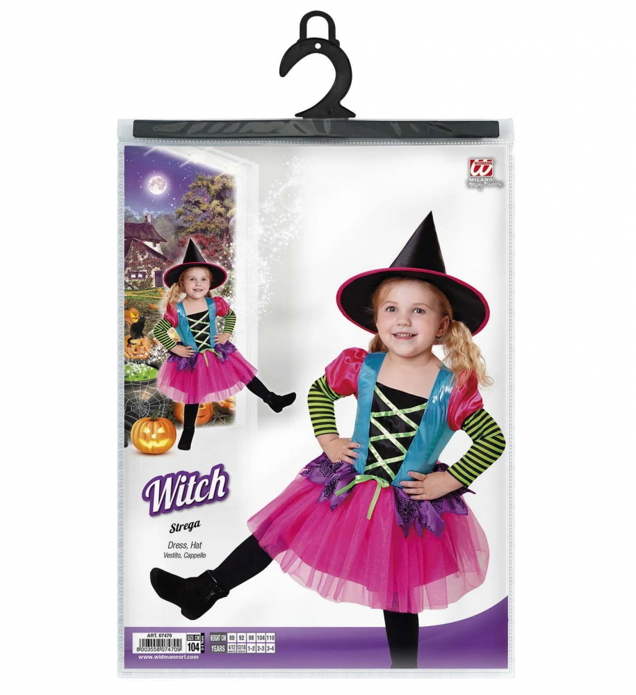 Costum Vrajitoare Colorata include rochia cu tul roz aplicat si palaria asortata.