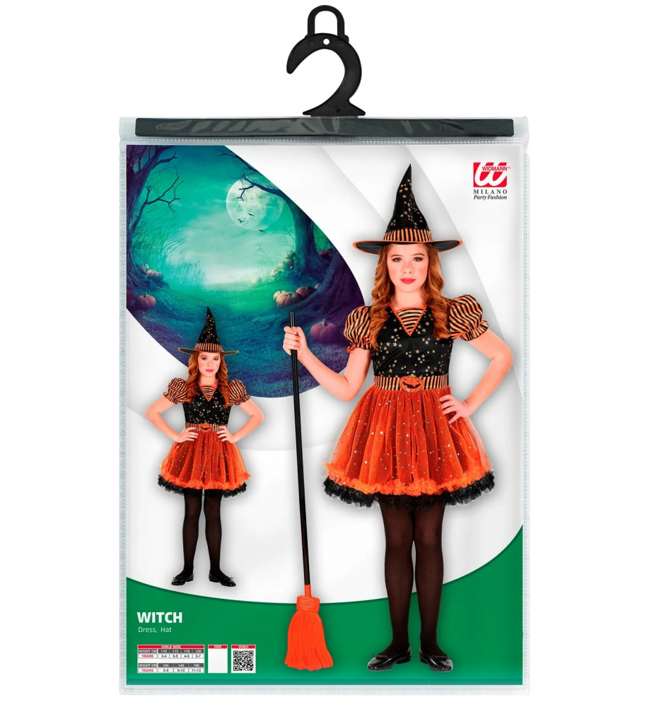 Costum Vrajitoare Dovleac include rochia cu model stelute, tul portocaliu aplicat si palaria asortata.