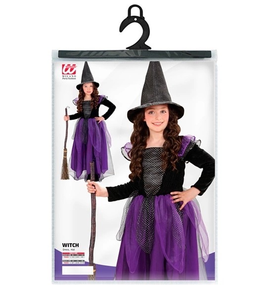 Costum Vrajitoare Magica Mov include rochia si palaria asortata.