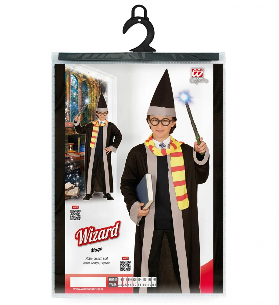 Costumul de vrajitor include roba, esarfa si palaria asortata.