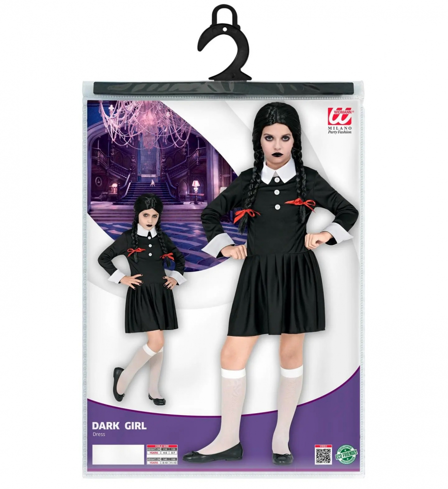 Costum Wednesday Addams Copii include rochia cu guler si maneci albe, alaturi de nasturi aplicati.