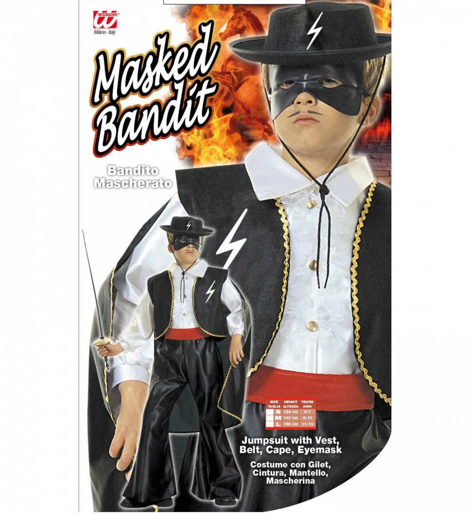 Costumul de Zorro include salopeta cu vesta, centura, pelerina si masca.
