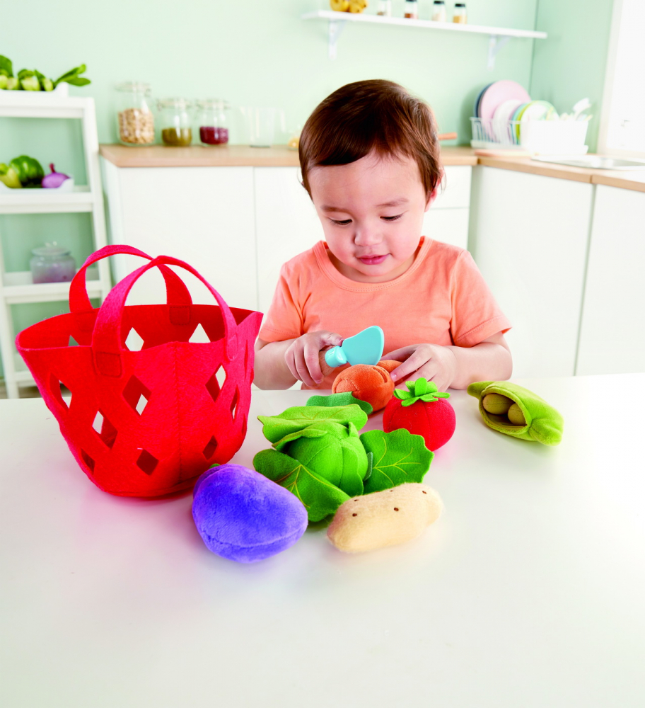 Cosul din pasla este moale si sigur pentru bebelusi. Include sase legume.
