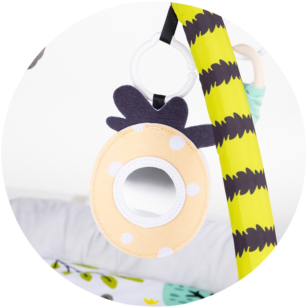 • Tesatura moale, texturile diferite si jucariile amuzante transforma acest covoras de joaca in cea mai buna sala de joaca pentru bebelus