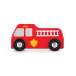 - Include 4 vehicule de salvare din lemn colorate: ambulanță, camion de pompieri, elicopter și mașină de poliție
