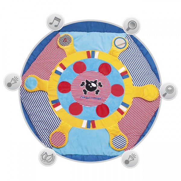 Coloratul covoras de joaca “Pirates”poate fi folosit pe post de tarc si este confectionat din material moale, colorat, prevazut cu strat interior subtire, impermeabil.Are douafunctii: il puteti folosi pe post de covoras de joaca de dimensiuni mai mari si tarc. Pentru a transforma covorasul intr-un tarc calduros, conectati efectiv marginile cu scai.Peretii tarcului nu permit celui mic sa iasa din el in timp ce se joaca si asigura un fel de siguranta. Jucariile atasate la arcade si elementele interactive capteaza atentia celui mic stimuland in acelasi timp dezvoltarea simtului olfactiv, auditiv si a aparatului locomotor.