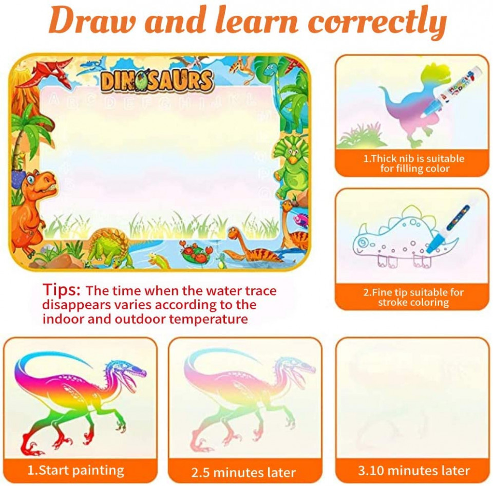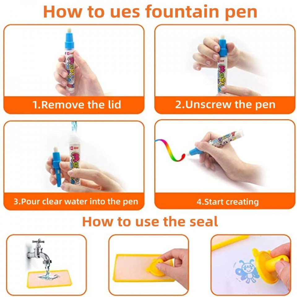 Datorita utilizarii unor markere speciale pentru apa, care nu murdaresc, distractia nu implica riscul unui copil sa picteze podeaua, peretii sau fata. Markerii care nu prezinta pete garanteaza ca, dupa joc, acesta va fi curat si ordonat. Markerele magice pot fi umplute cu apa de multe ori, ceea ce inseamna ca distractia nu se termina niciodata. Dupa ce desenul se usuca, imaginile vor disparea si puteti desena din nou in voie! Covorasele pot fi folosite si de copiii mai mici, cu conditia sa nu-i lasam sa se joace cu markerele si stampilele de mici dimensiuni. Sub supravegherea adultului, rogojinile pot fi folosite, de exemplu, prin inmuierea mainilor cu apa si reflectarea formelor de pe covoras.