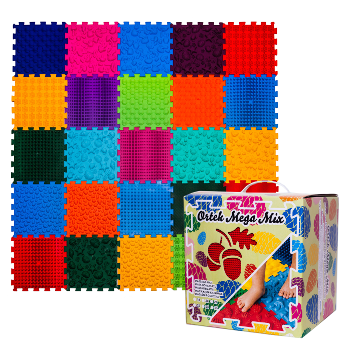 Covorașul ortopedic pentru masaj este alcătuit din 25 plăcuțe tip puzzle (26x26 cm fiecare), ușor de asamblat și combinat, ce oferă o experiență senzorială unică. Texturile variate – iarbă, lotuși, marin, piramide, prundiș, scoici, ciuperci, ghinde și spini – stimulează mușchii tălpilor și zonele reflexogene, ajutând la prevenirea și corectarea problemelor ortopedice.