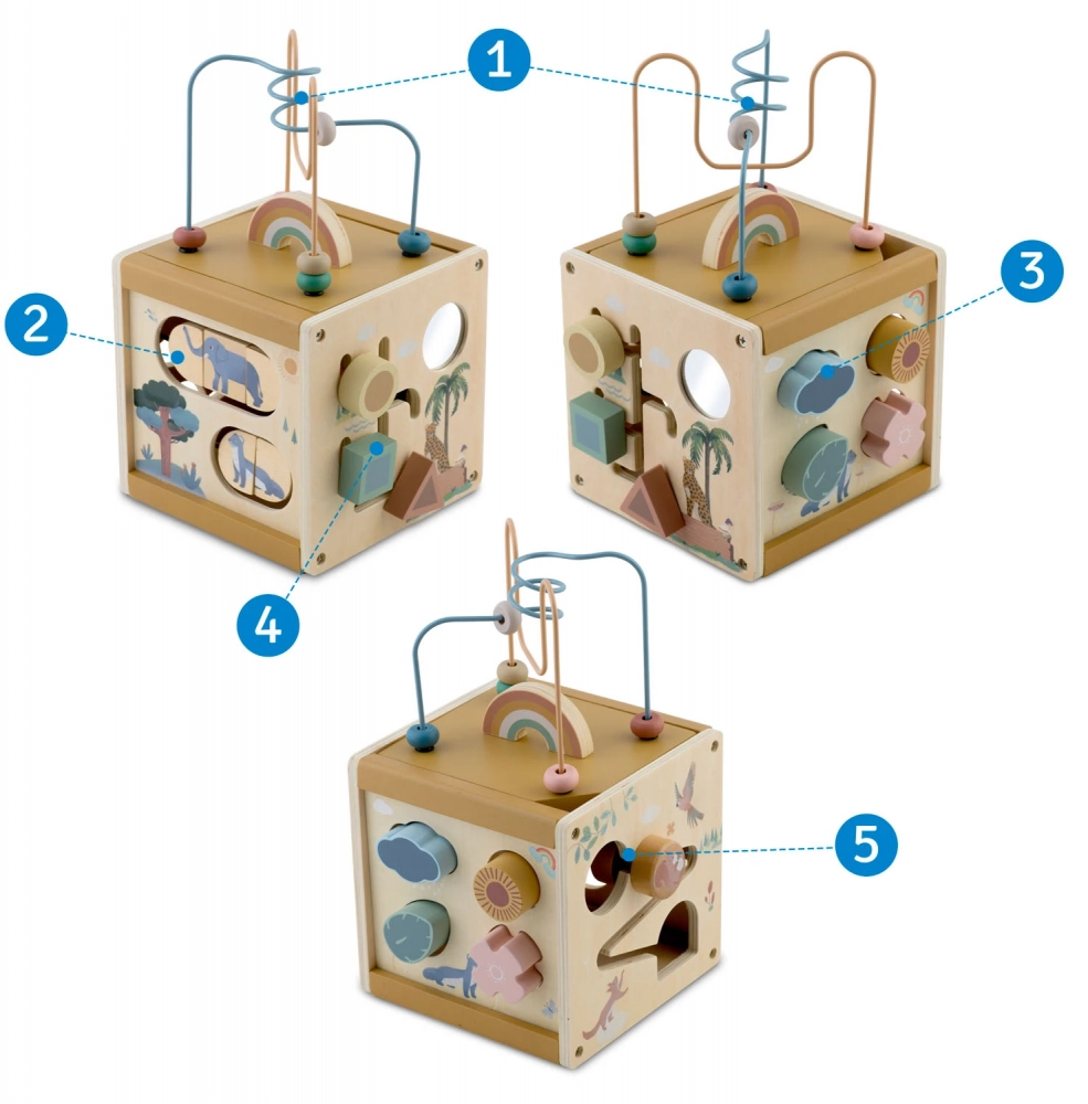 Dezvoltarea abilitatilor motorii: echipat cu o varietate de activitati, cum ar fi un labirint, abac si sortator, cubul sprijina dezvoltarea abilitatilor motorii fine.