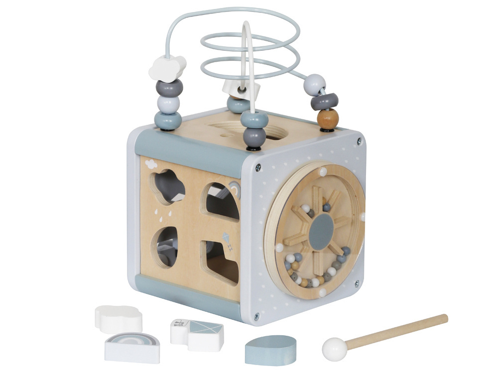 Acest cub robust din lemn ofera o varietate de elemente interactive si provocari senzoriale care contribuie la dezvoltarea abilitatilor motorii fine, a gandirii logice si a coordonarii ochi-mana.