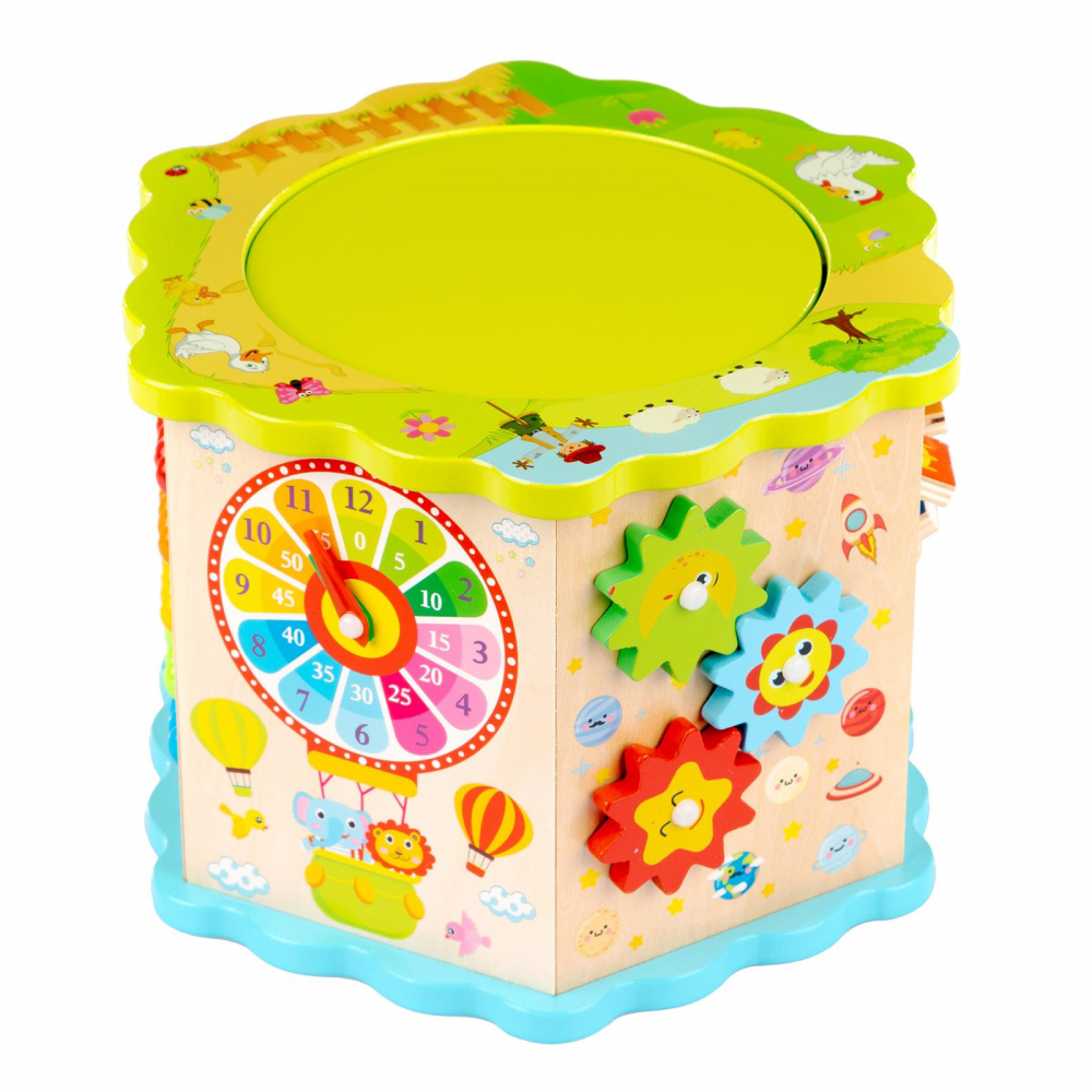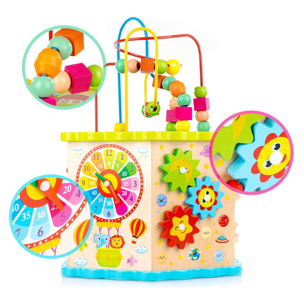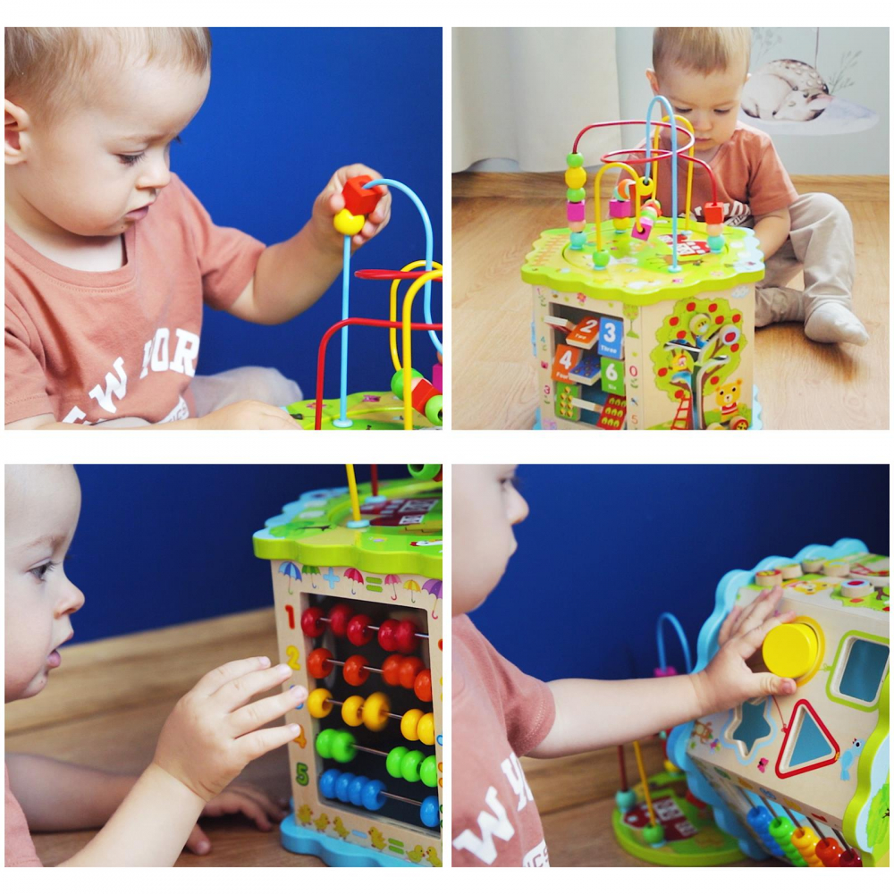 Cubul incurajeaza dezvoltarea abilitatilor motorii, coordonarii mainilor, imaginatiei si rezolvarii problemelor. Placuta la atingere, fara margini ascutite. Design unic si de inalta calitate.