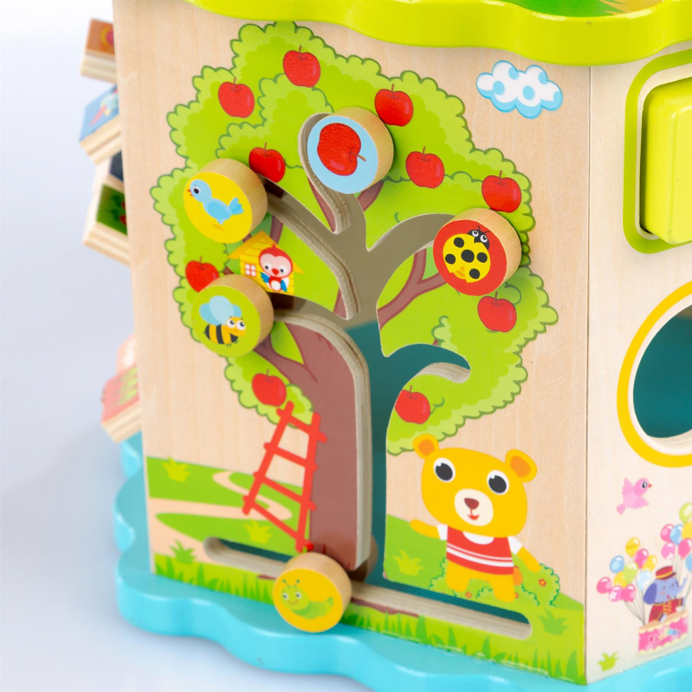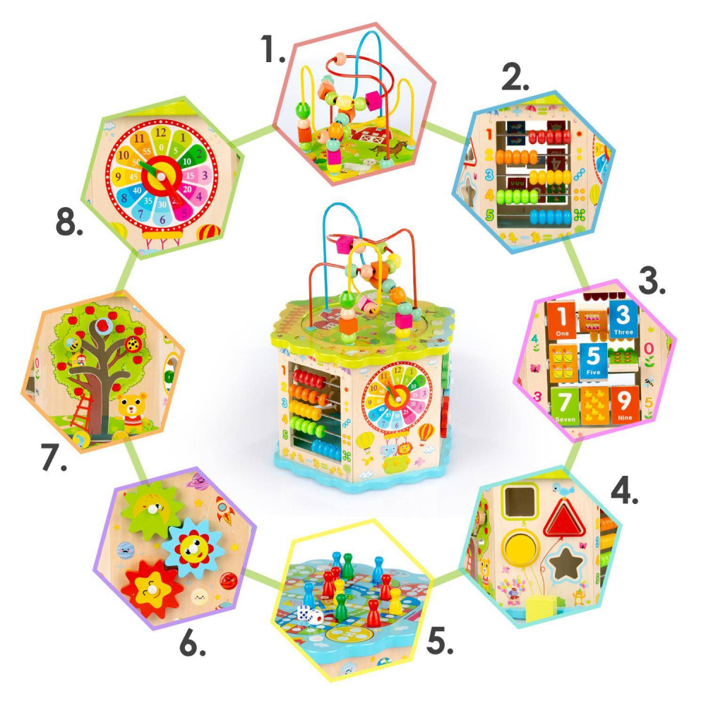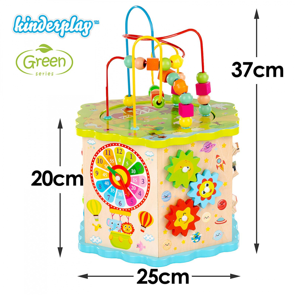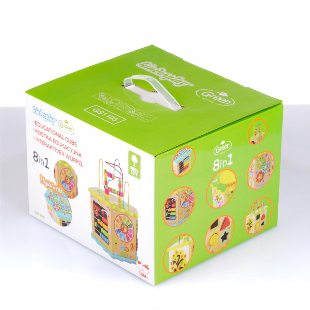 Cub educational multifunctional 8 in 1 din lemn, pentru copii Kinderplay, cu activitati si forme de sortat, suprafata superioara detasabila, 37 x 25 cm Green