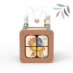 Diversele activități includ: un sortator de forme, joc de traseu, puzzle, labirint cu mărgele și roți dințate.