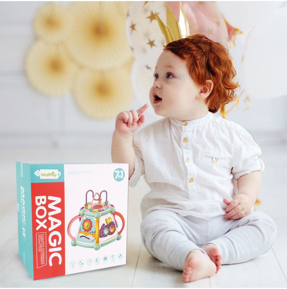 Cub multicolor 7 in 1 cu activitati educative, functii multiple, sortator de forme, elemente rotative, forme glisante, butoane functionale, lumini si sunete, 25 x 22 cm, Magic Box
