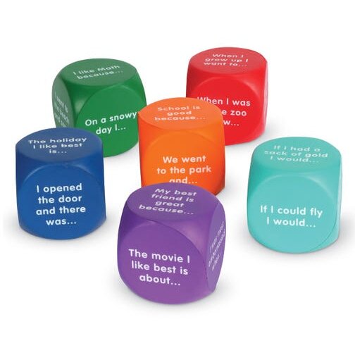 Copiii pot folosi cuburile atat pentru a crea si a spune povesti cat mai creative, cat si pentru activitati de scriere a unor texte non-fictionale. Pe fiecare parte cubul are diferite propozitii incomplete pentru a-i inspira atunci cand compun (36 de propozitii). Pachetul include ghid de activitate si cuburi ce masoara 4 cm. Produsul este disponibil doar in limba engleza.