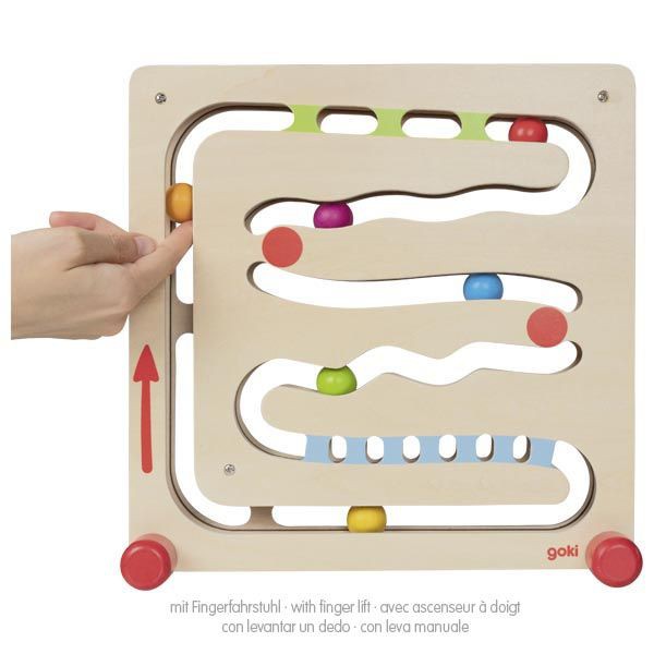 Joc din lemn cu bile blocate în circuit. Trebuie să aduci bilele în sus, pe partea laterală a jocului, acolo unde este săgeata. Apoi coboară urmând meandrele săniușului, spre deliciul copiilor care nu se obosesc niciodată de ele!