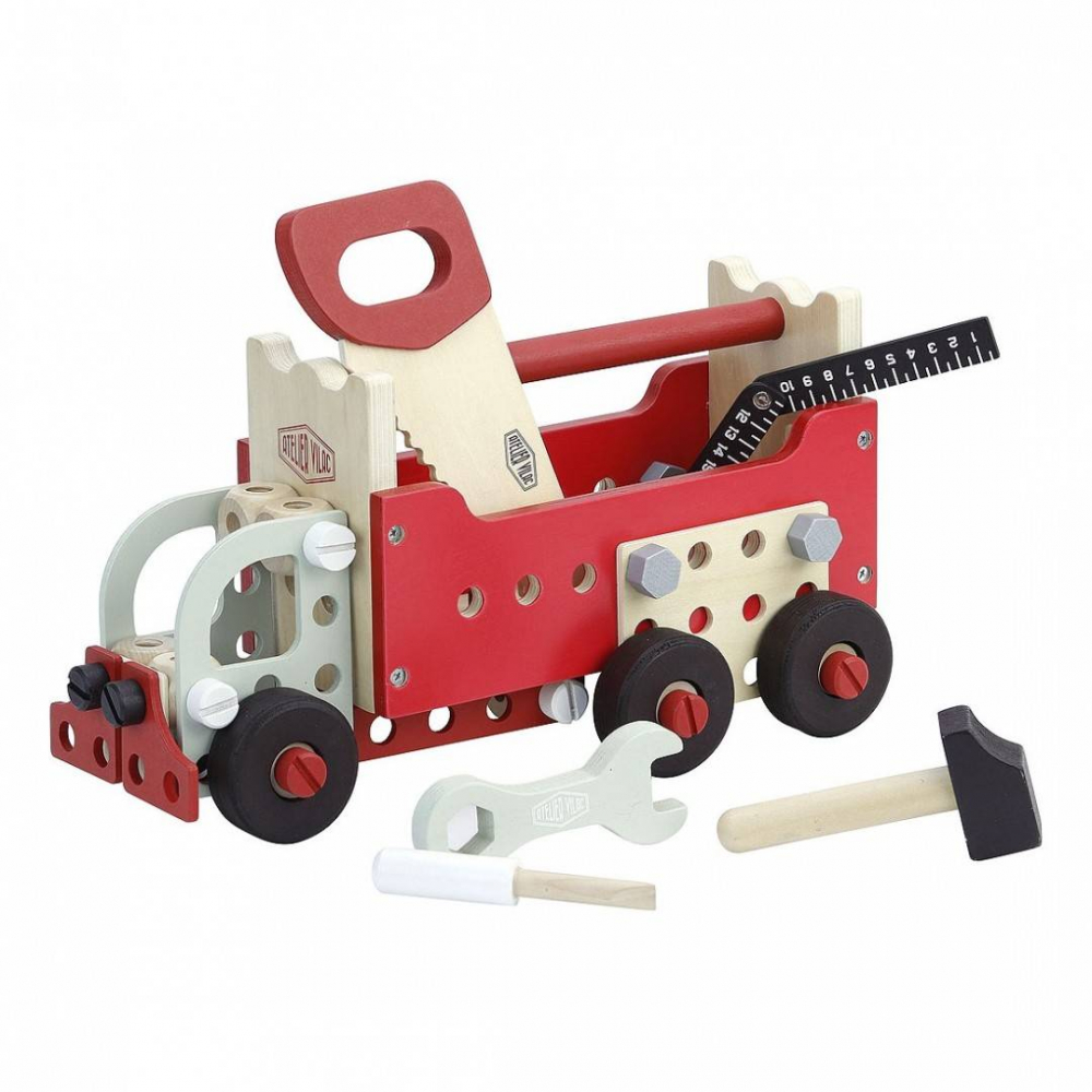 Rasturnata, ea devine banc de lucru, iar copii pot invata sa insurubeze, sa foloseasca fierastraul si ciocanul, sa masoare si sa stranga cu cheia franceza, asemenea adultilor!