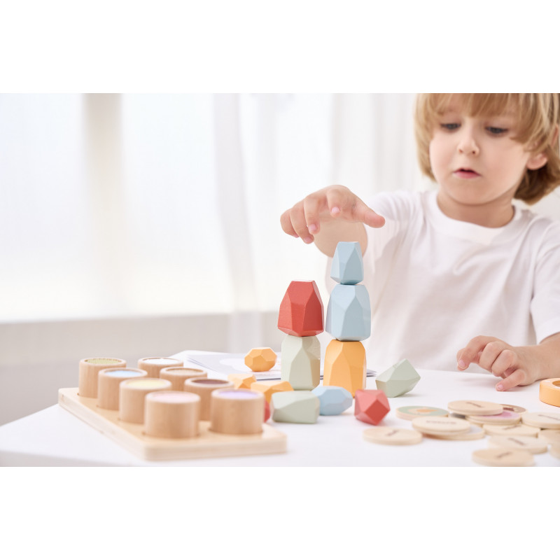 Acest set contine 16 pietre de diferite dimensiuni si culori, perfecte pentru stivuire, echilibru si constructie! Jocul dezvolta rabdarea, dexteritatea si motricitatea fina, iar prin explorarea libera a combinatiilor, copilul isi stimuleaza imaginatia si creativitatea.