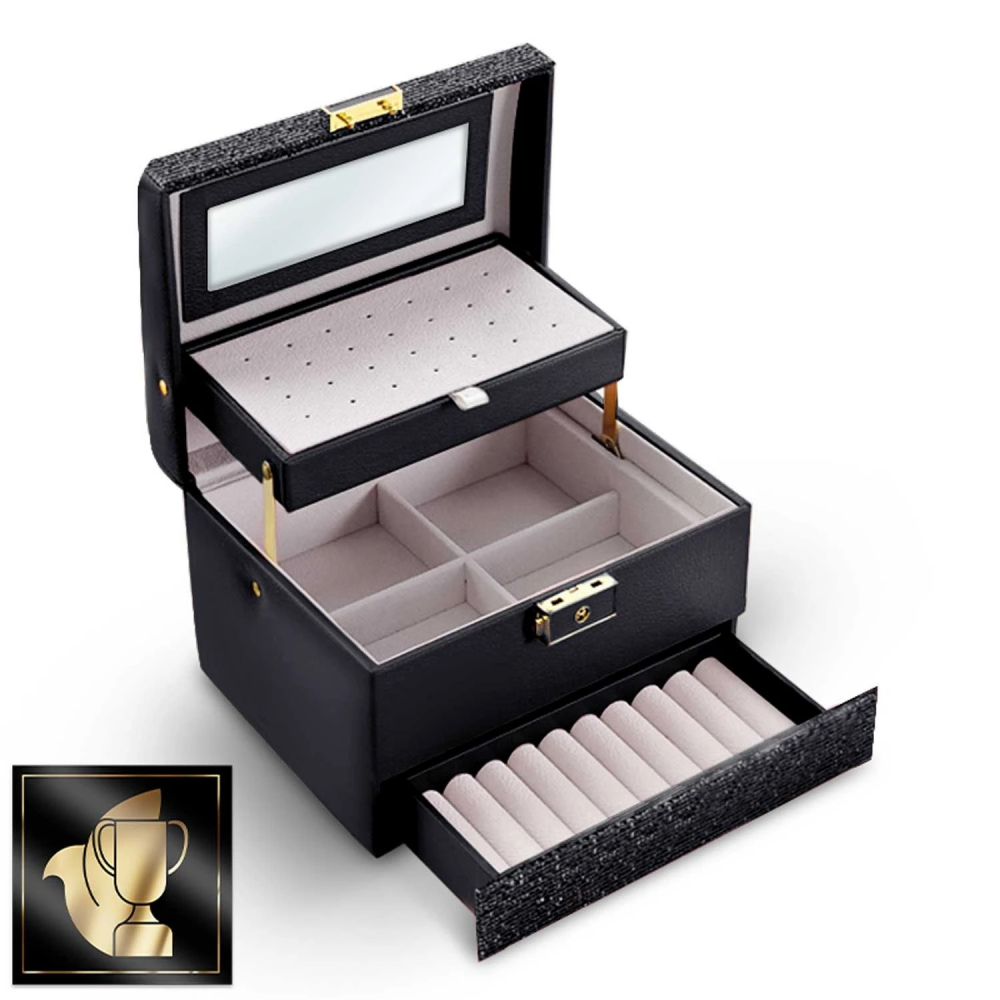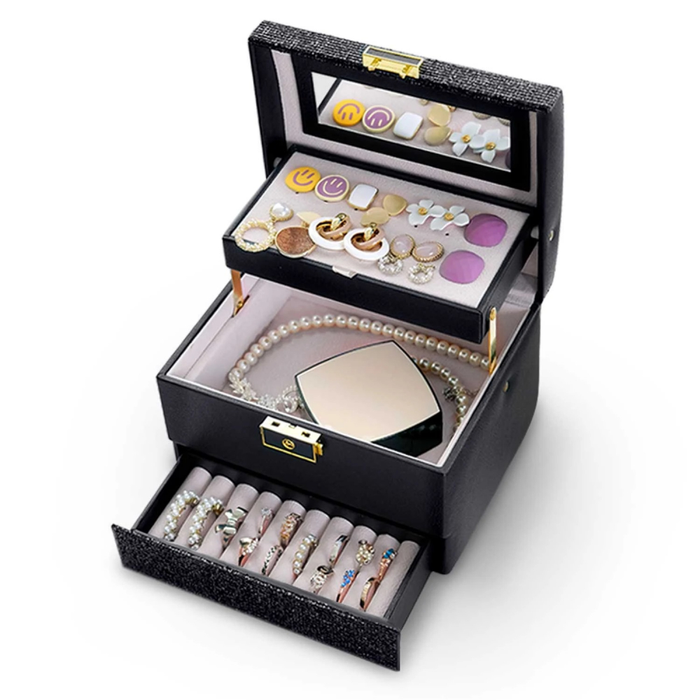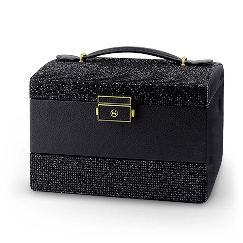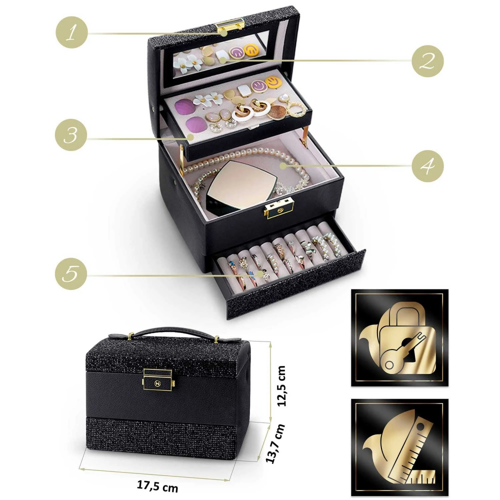 Cutie de bijuterii si accesorii 17.5x13.7x12.5cm Massido cu 3 nivele de organizare,oglinda, functie de blocare si maner pentru transport Black