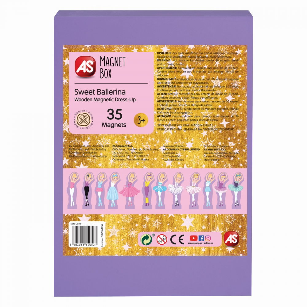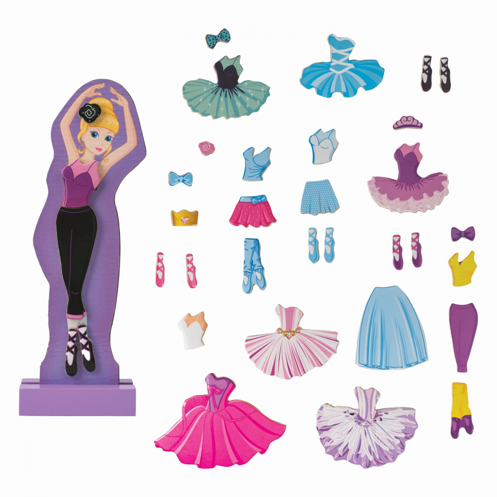 Setul include 1 papusa balerina magnetica din lemn, cu baza magnetica din lemn si 35 de magneti din lemn cu multe optiuni de rochii, puncte si accesorii pentru par pentru a o imbraca de cate ori doriti.