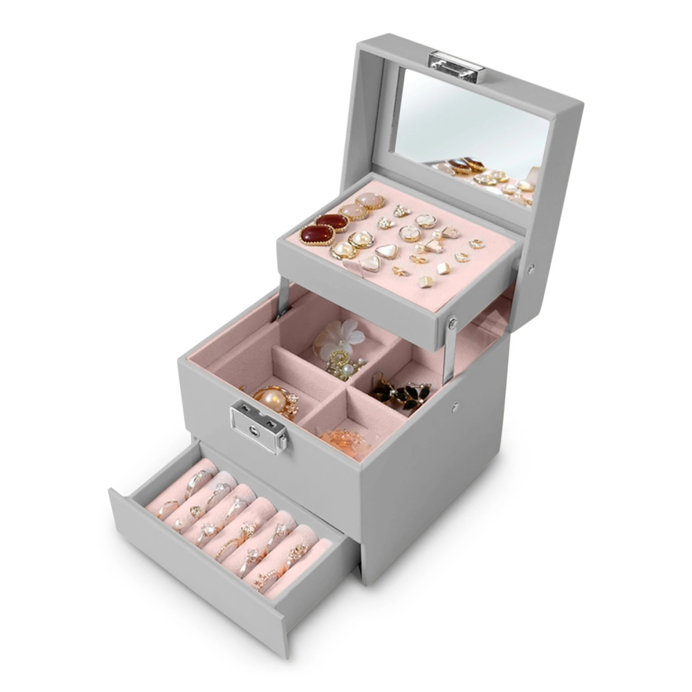 Cutie pentru bijuterii si accesorii 13x13x12.5cm Massido cu maner,oglinda,material exterior din piele PU,incuietoare si compartimentare practica Grey