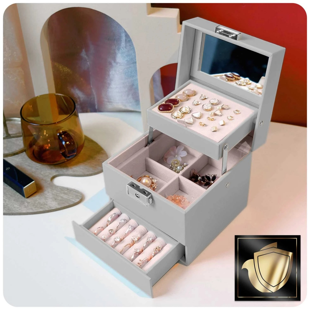 Blocabil cu cheie (prevenirea deschiderii accidentale), umerase de colier ,oglinda ,buzunar mare ,loc pentru inele, spatiu pentru cercei, compartimente practice, sertare cu compartimente de inalta rezistenta, rezistent la abraziune, material PU, piele ecologica.