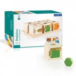 - Setul include: 6 cutii solide din lemn cu incuietori, 6 forme geometrice din lemn si o tavita de depozitare.