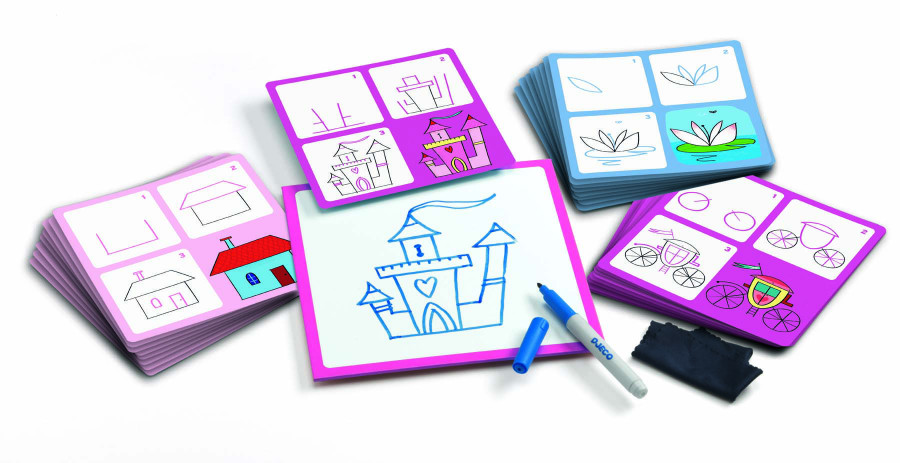 Jocul contine: plansa pentru desenat, o carioca - marker, burete, 24 cartonase care arata etapele obtinerii unui desen.