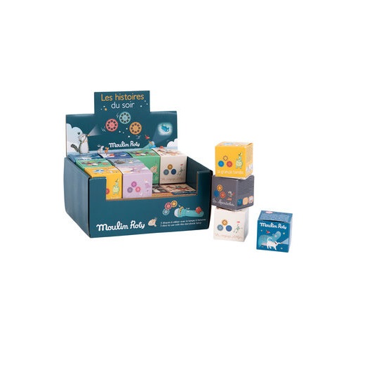 Setul conţine 3 discuri cu ”diapozitive” (3 poveşti cu 24 de imagini), compatibile cu orice model de lanternă Moulin Roty.