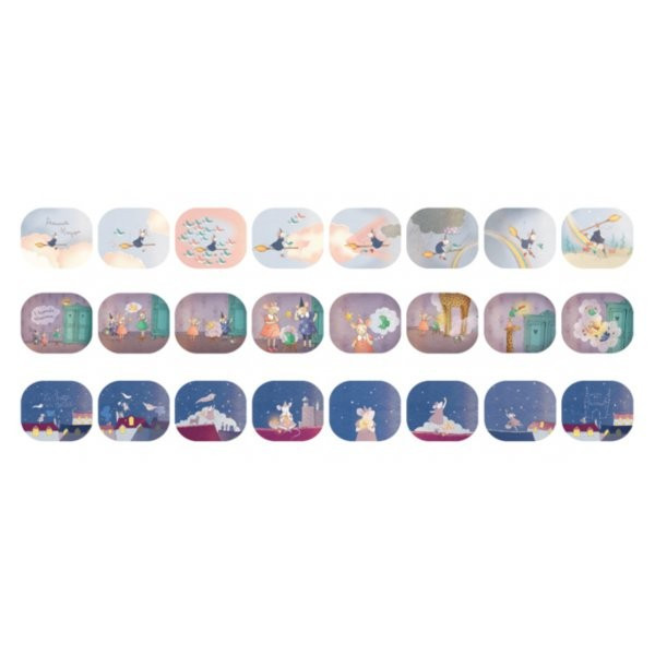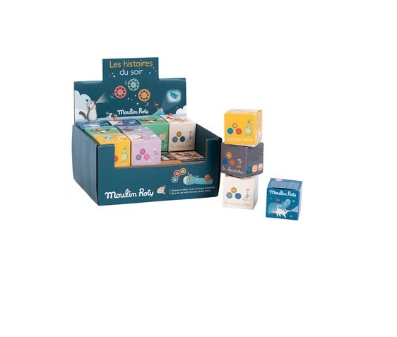 Setul conţine 3 discuri cu ”diapozitive” (3 poveşti cu 24 de imagini), compatibile cu orice model de lanternă Moulin Roty.