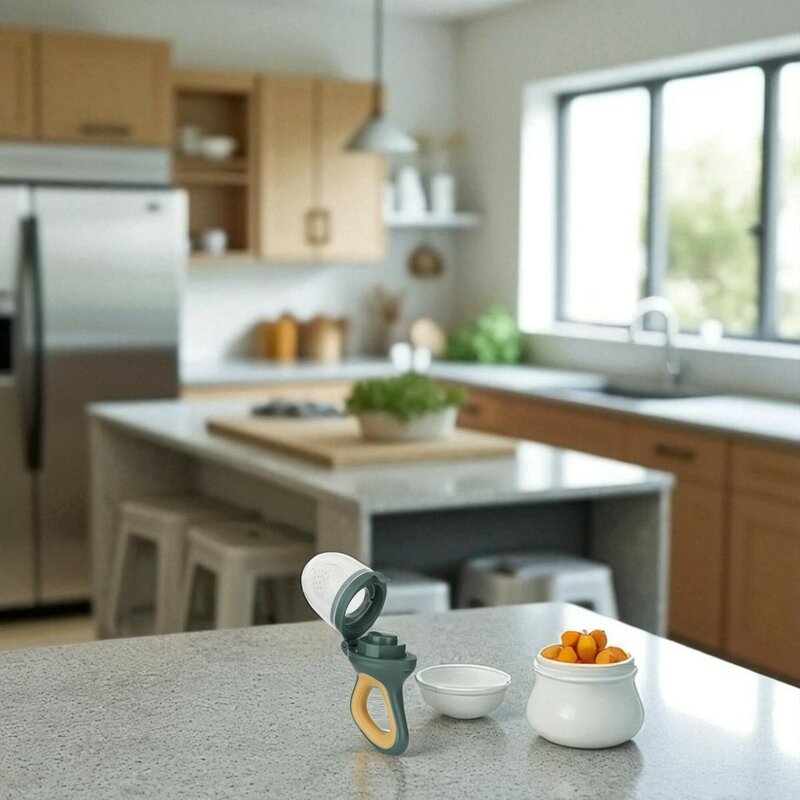 Dispozitiv de hranire Petite&Mars pentru fructe si legume, include capac de protectie, 6+ luni, Verde/Ocru