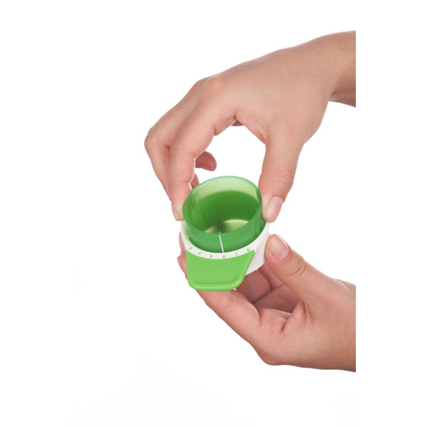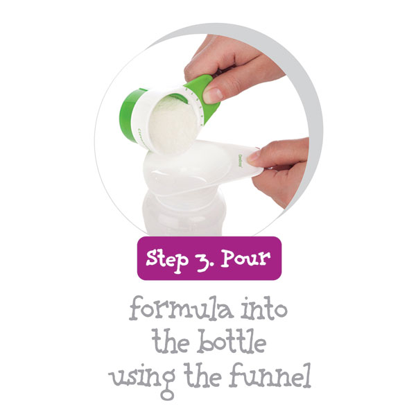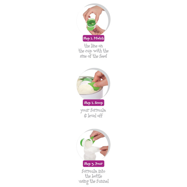 - E foarte simplu de utilizat, se seteaza cupa in dreptul cantitatii dorite, dupa care se umple cu lapte praf, apoi cu ajutorul palniei se adauga in sticla biberonului.