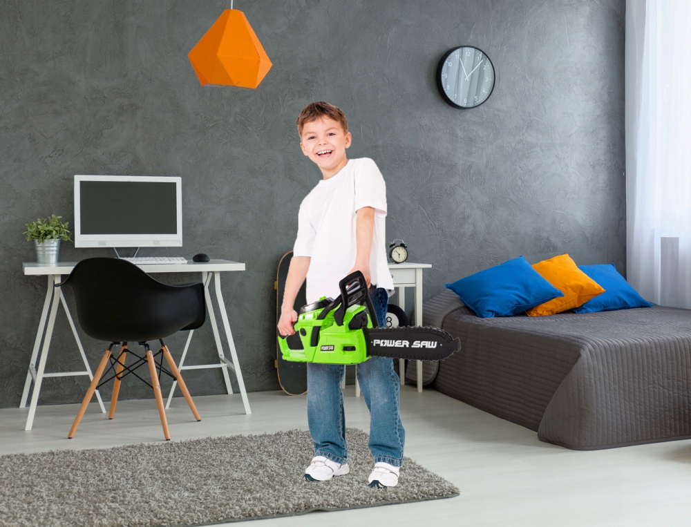 * O jucarie sub forma unui ferastrau electric sigur este un instrument indispensabil pentru un mic taietor de lemne.