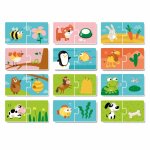 - setul include 24 piese din care pot fi asamblate 12 puzzle-uri diferite