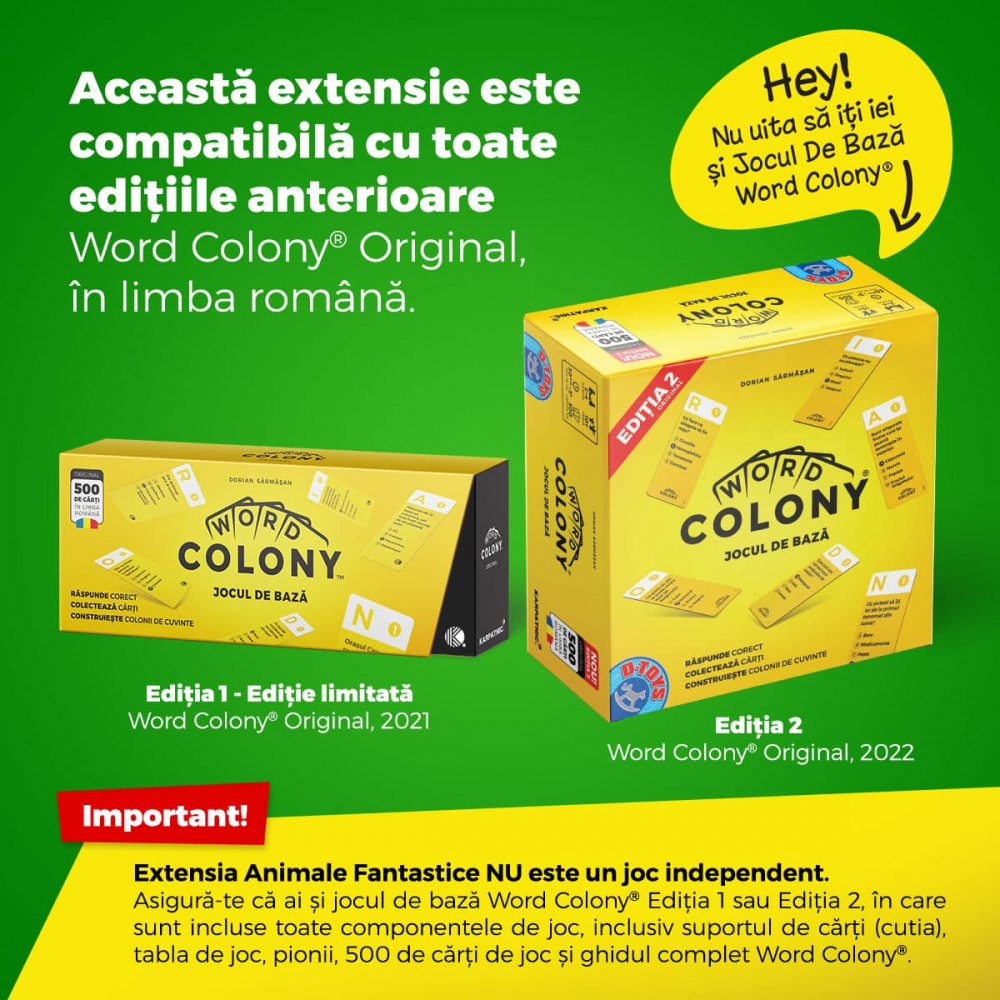 Asigură-te că ai și jocul de bază Word Colony Ediția 1 sau 2, în care sunt incluse toate componentele de joc, inclusiv suportul de cărți (cutia), pionii, tabla de joc, 500 de cărți de joc și ghidul complet Word Colony.
