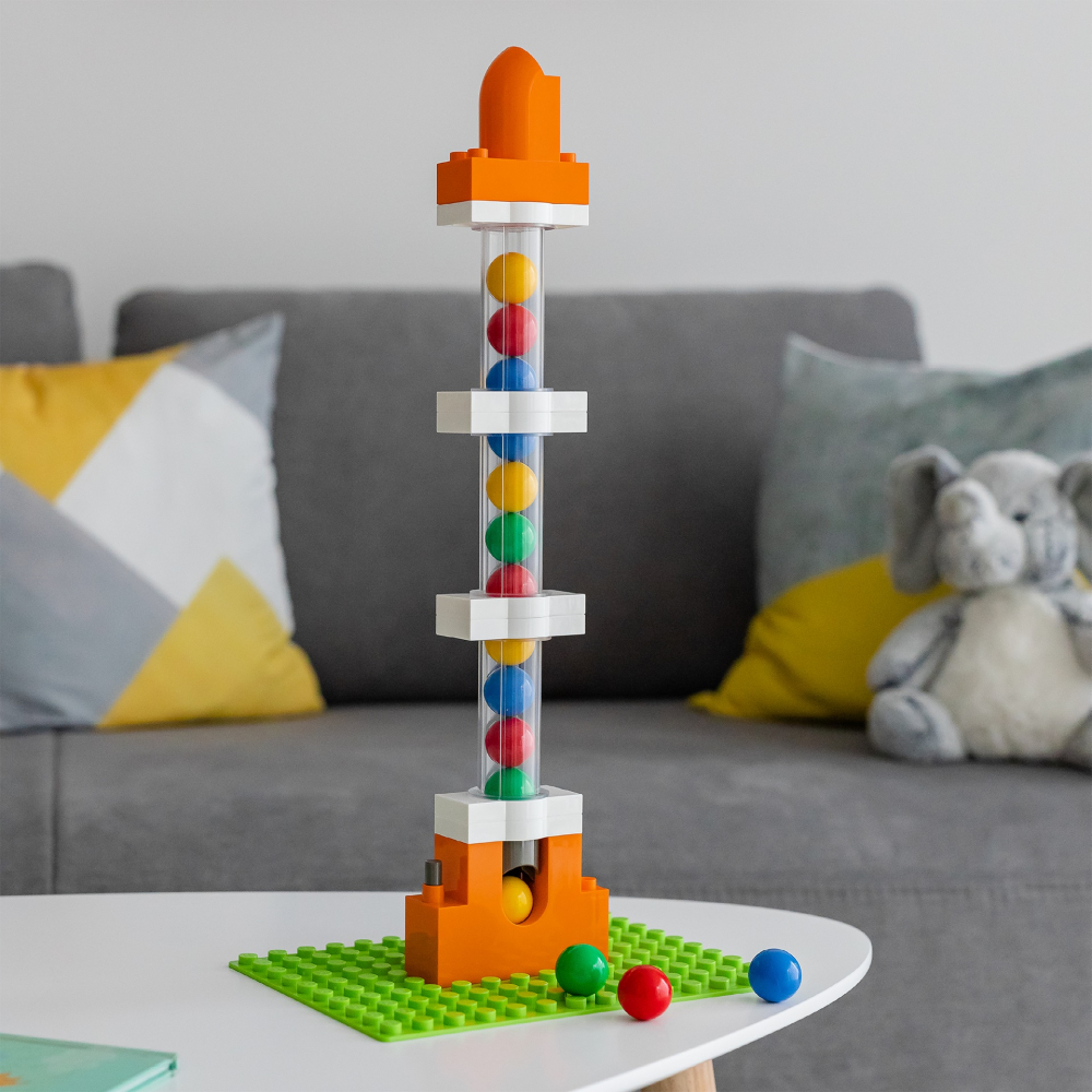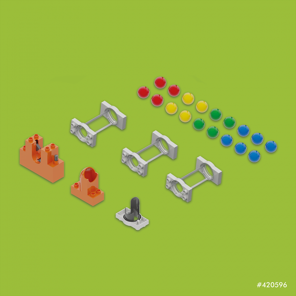 Tuburile transparente au cinci blocuri inaltime, astfel incat sa puteti vedea ca multe bile colorate sunt deja inauntru, iar pozitia rece de pornire a marmurei ii ofera apoi bilei impulsul necesar pentru a incepe din nou pe pista.