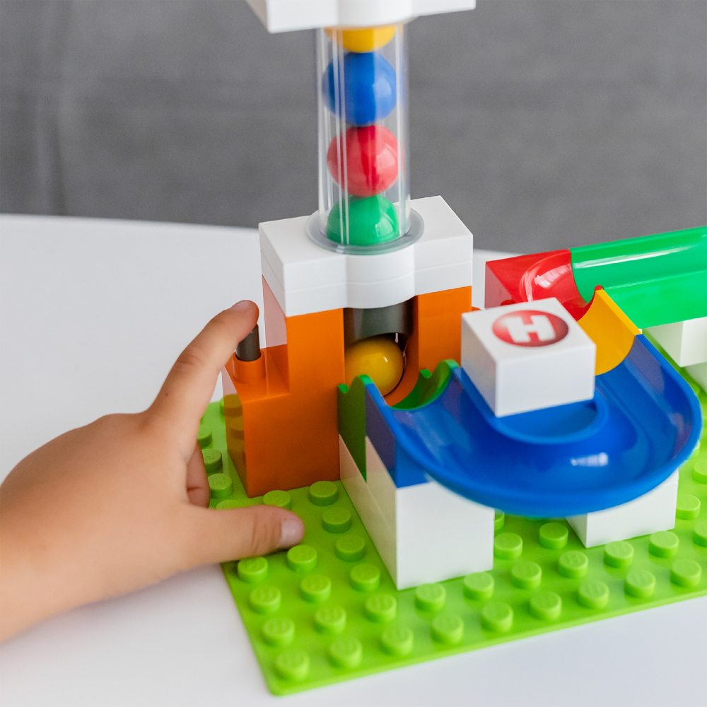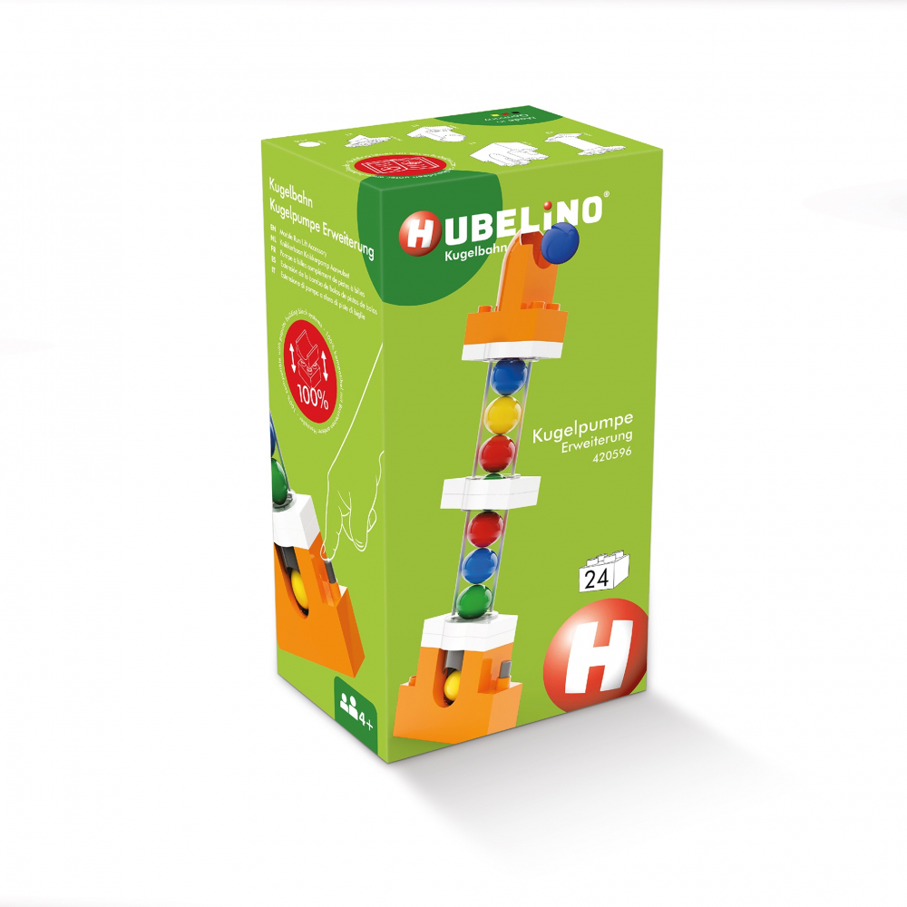 Accesoriul de ridicare de marble run transforma cursul de marble run intr-un circuit pornit cu ajutorul unui mecanism de pompa.