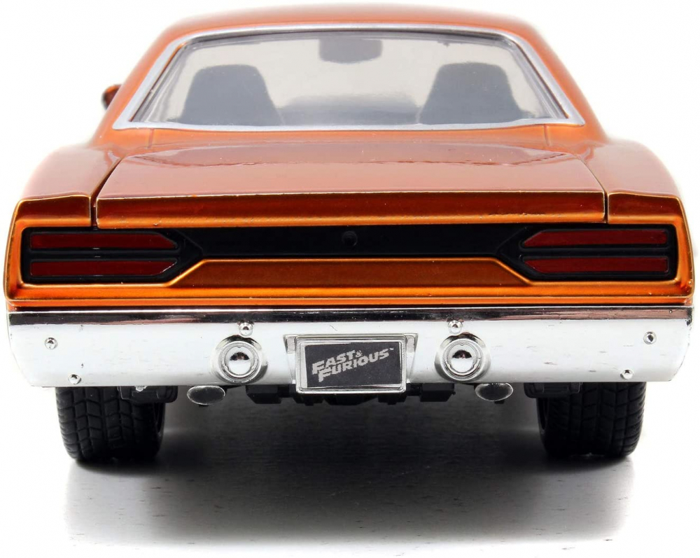 Masinuta din metal din seria Fast & Furious, 1970 Plymouth Road Runner, scara 124, cu usi, capota si portbagaj ce se pot deschide.