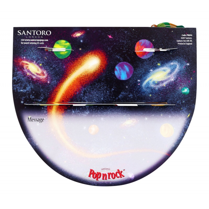 Felicitarea 3D PopnRock Spatiu este o felicitare venita dintr-o galaxie foarte indepartata, care va fascina prin imaginea futuristica si elementele mobile. Aceasta felicitare este formata din doua parti care fac ca felicitarea sa se poata legana in voie. Pe spatele felicitarii vei regasi un camp pentru text, ca mesajul tau sa cucureasca inimile celor dragi.
