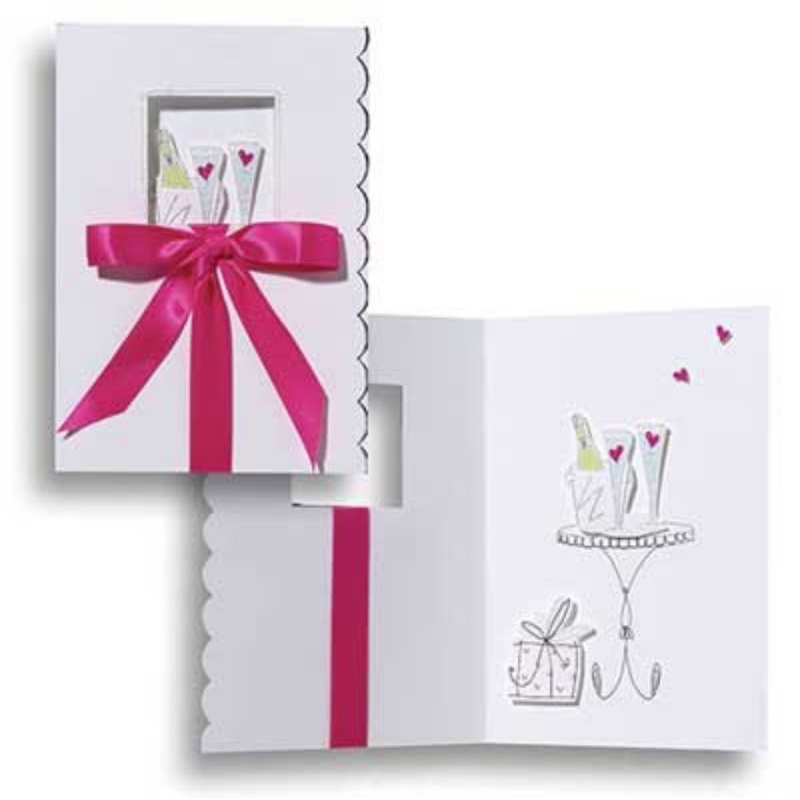 In interior sunt doua pahare de sampanie in format 3D, iar pe fata are atasata o fundita din panglica roz.