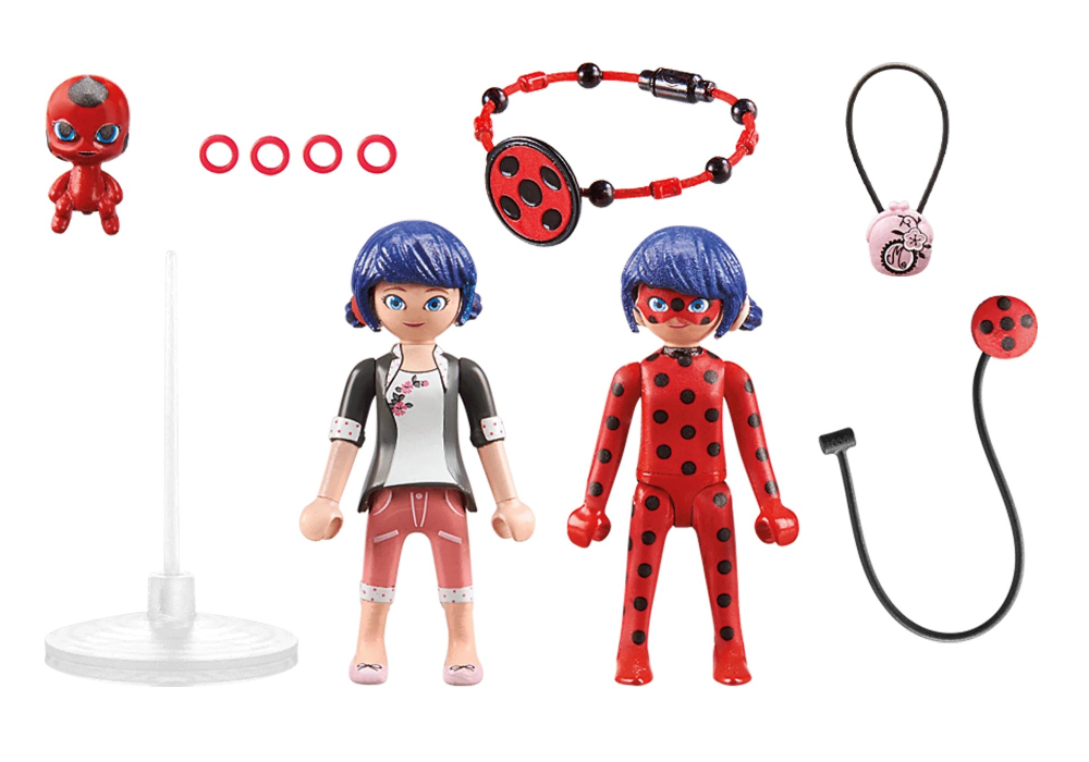 Acest set de joaca il prezinta pe personajul principal, Marinette Dupain-Cheng, in doua variante – ca Marinette insasi si transformata in supererou, Ladybug.