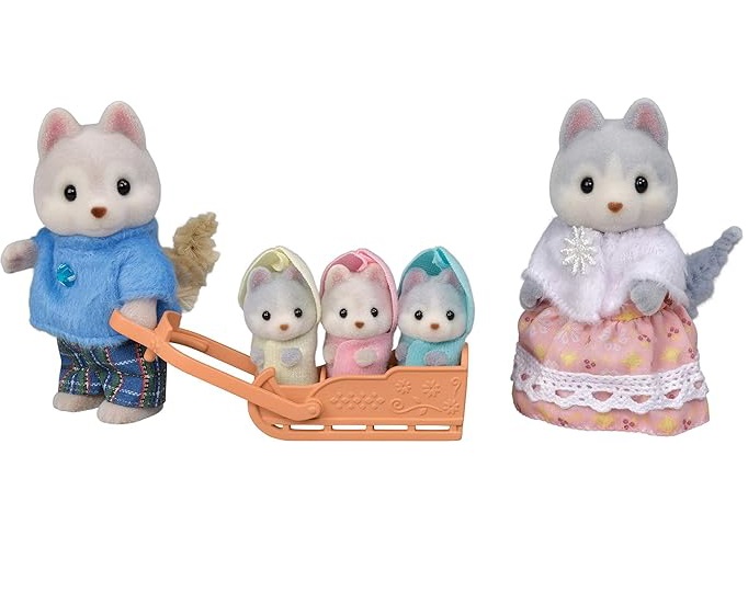 Setul de Figurine Sylvanian Families - Familia Catelusilor Hysky este format din cele cinci personaje: tatal husky Vincent, mama Avril si tripletii: Rae, Drake si Nelly.
