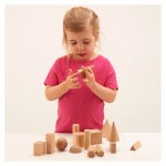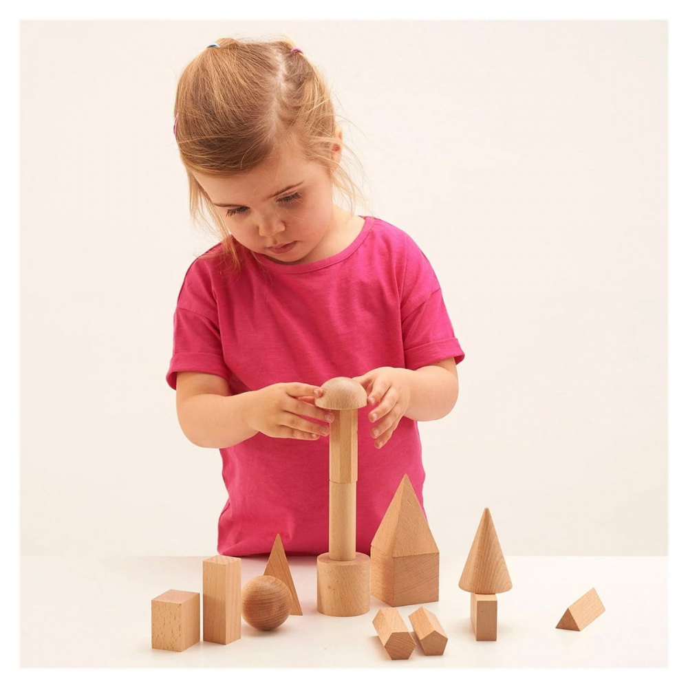 - Acest set de 15 forme geometrice din lemn natural este perfect pentru ca cei mici sa exploreze concepte precum suprafata, volumul, dimensiunile si unghiurile intr-un mod tactil si vizual.