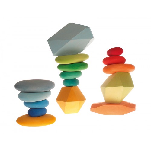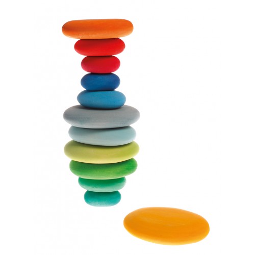 Piesele imita forma unor pietre de rau si pot fi folosite pentru activitati de sortare (de la mic la mare si invers) si stivuire, sau pot fi integrate in alte jocuri cu piese din lemn sau alte materiale.