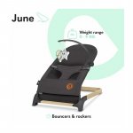- Leganat in balansoar, copilul se poate odihni linistit . Datorita profilului adecvat al lui June, se va mentine pozitia corecta de sustinere a coloanei vertebrale si a capului copilului. Husa produsului a fost croita pentru a se conforma curbelor naturale ale corpului distribuind uniform greutatea corpului. In plus, este placuta la atingere, nu irita pielea si este lavabila. Odihna linistita este importanta, dar probabil te intrebi ce se intampla daca copilul tau are chef sa se joace? June are o arcada detasabila cu doua jucarii care il vor tine ocupat cu succes pe bebelus. Accesoriile colorate vor incuraja copilul sa se miste si sa-si intinda mainile pentru a-si satisface curiozitatea. Designul minimalist al lui June il face sa se potriveasca in orice interior.