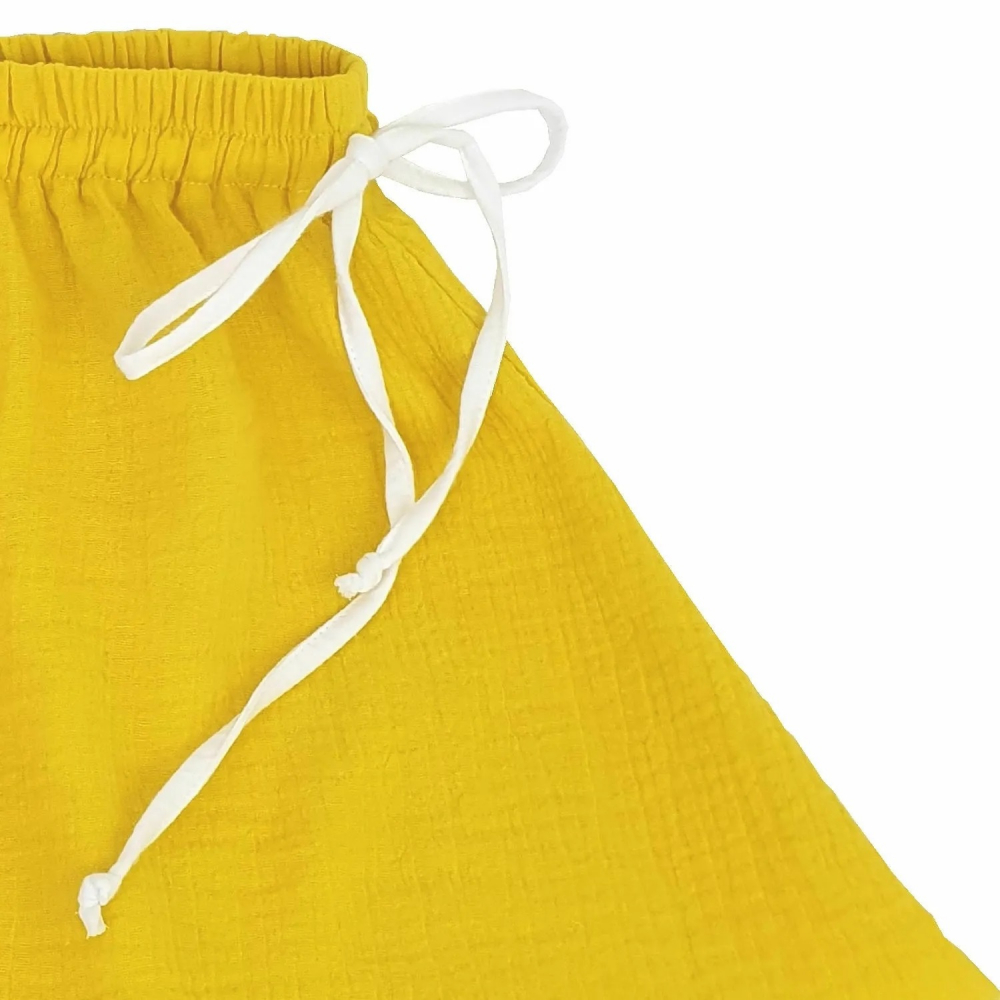 Fusta este realizata in atelierul nostru din Cluj, din materialul numit "tesatura oficiala a verii": Muselina. Are un design minimalist, lejer si comod, conceput pentru corpul mereu in miscare al copiilor.