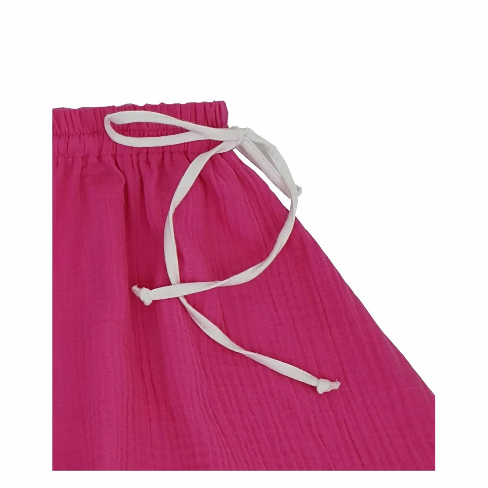 Fusta este realizata in atelierul nostru din Cluj, din materialul numit "tesatura oficiala a verii": Muselina. Are un design minimalist, lejer si comod, conceput pentru corpul mereu in miscare al copiilor.